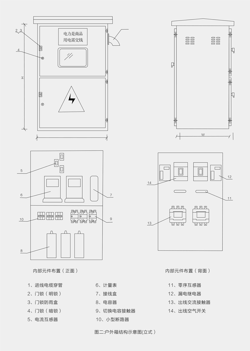 箱體結(jié)構(gòu)分立式和臥式,外殼采用2mm不銹鋼板經(jīng)多重折邊工藝彎制(或采用蜂窩結(jié)構(gòu)的不銹鋼雙夾層復(fù)合板,具有阻燃、環(huán)保、隔熱、防凝露等性能),采用特別不銹鋼焊接工藝,箱體成型后整體強(qiáng)度高,表面光潔如鏡,不留焊縫痕跡;內(nèi)部安裝梁(板)為熱鍍鋅工藝處理,不銹蝕;箱體前后開(kāi)門,便于用戶操作和檢修,門四周鑲有高彈力耐老化密封膠條,每扇門均裝有明暗兩種門]鎖,明鎖配有防堵防銹的遮雨罩;計(jì)量室全封閉帶鉛封裝置;箱體側(cè)面裝有防雨防異物的進(jìn)線電纜穿管,底部沖有通風(fēng)孔和電纜出線孔,頂部設(shè)有通風(fēng)道和絲網(wǎng),具有防水、防銹、防塵、防異物的功能,防護(hù)等級(jí):IP54。