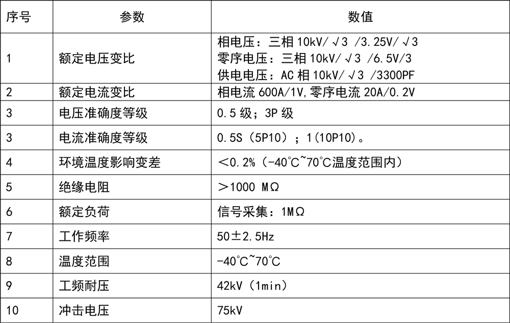 斷路器內(nèi)置相電流、零序電流、相電壓、零序電壓傳感器,取電電容,主要參數(shù)見(jiàn)表。